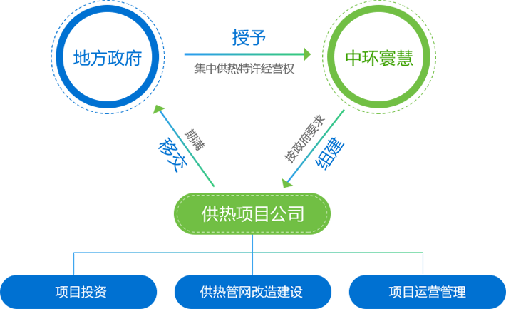 由地方政府授予集中供熱特許經營權,按政府要求組建供熱項目公司,承擔全部熱網改造、建設及項目運營管理工作。